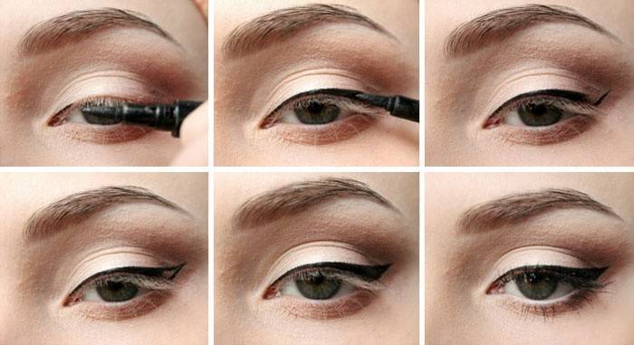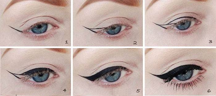 Здесь важно правильно нарисовать тонкие и ровные очертания глаз карандашом или подводкой. Вы можете использовать как стойкие карандаши, так и подводки. Рисуются тонкие стрелки следующим образом: сначала очертания хвостика,