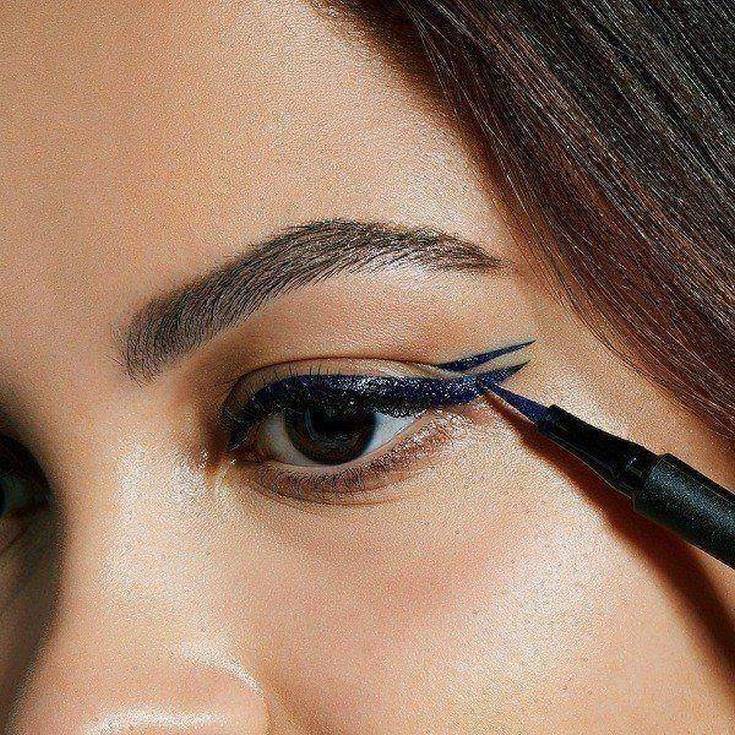 Как определить, под каким углом должен быть ее кончик? Воспользуйтесь хитростью визажистов. Приложите ручку кисти или карандаш так, чтобы он пересекал внешний уголок глаза и крыло носа. Кончик стрелки не должен быть ниже линии пересечения.