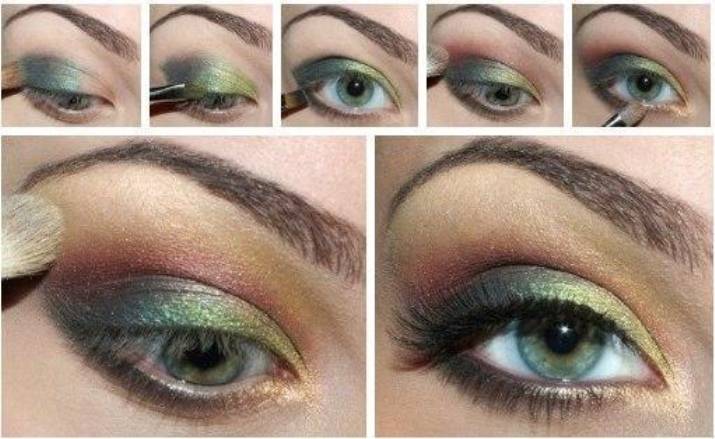 Когда с базовым макияжем покончено, переходим к макияжу глаз. Можно воспользоваться чёрным карандашом для глаз либо жидкой подводкой. По верху ресниц верхнего века проводится прямая линия и продлевается за его границы. Внизу бровей наносится светлый оттенок, а подвижная часть века покрывается золотистым, бежевым, жёлтым или коричневым цветом. Но это не панацея – оттенки можно выбирать по своему усмотрению: синий, голубой, салатовый. Всё связано с оттенком ваших глаз. Если они карие, вам подойдут тени зелёного и фиолетового тона, если голубые – серые или коричневые, а к серым глазам лучшим выбором станут синие тени.