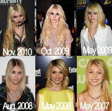 В процессе взросления менялись и образы знаменитости, при чем, далеко, не всегда в лучшую сторону. Тейлор Момсен без макияжа, едва ли, не единственная знаменитость, которая без декоративной косметики выглядит намного моложе, привлекательнее, и добрее, чем при «полном параде». Как известно, эта талантливая девушка является профессиональным рок-музыкантом и, наверное, брутальный рокерский образ Тейлор использует чаще всего, при чем, не только на сцене, но и в обычной, повседневной жизни. Зрелище, нужно сказать, не для слабонервных: угольные интенсивные тени и бледная, почти белая, кожа в сочетании с яркой губной помадой. Странно и тревожно то обстоятельство, что такой вызывающий и, немного шокирующий, образ становится настоящим лицом артистки. Ведь отыскать свежие фотографии Тейлор Момсен без макияжа, уже не представляется возможным.