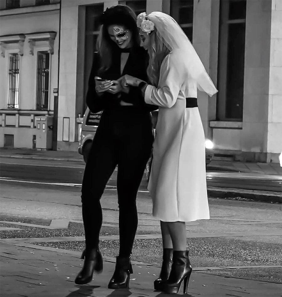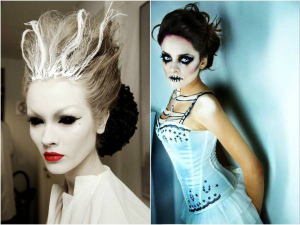 Достаточно просто в домашних условиях создать образ черной невесты. Для этого потребует платье и фата соответствующего цвета. Эффектный макияж черной невесты на Хэллоуин следует делать, используя контрастные цвета – белый, красный и черный. На лицо наносят максимально светлый тон, а вот в качестве румян используют черные тени. Их наносят на область скул широкой кистью и хорошо растушевывают. Брови и глаза стоит подчеркнуть черным карандашом, можно сделать макияж в технике «смоки айз». Отсталость только выделить губы кроваво-красной помадой с блеском.