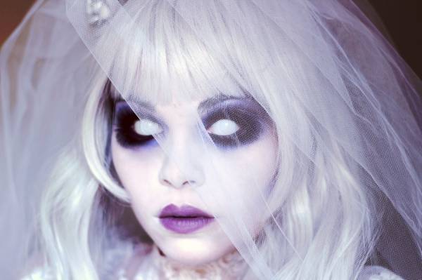 Если создается образ невесты-приведения, то потребуется много газовых тканей, чтобы создать ощущение бесплотности. Разумеется, призрак невесты должен быть очень бледным, поэтому при создании макияжа потребуется пудра максимально светлого тона. Можно добавить к пудре немного детской присыпки или талька и рассыпчатых голубых теней. А вот вокруг глаз стоит положить тени синего цвета и хорошо растушевать их, чтобы взгляд казался потусторонним.
