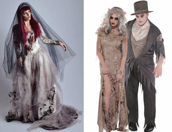 Всем поклонникам данного мультфильма известно, что основой наряда мертвой невесты является свадебное платье макси длины, которое изрядно потрепалось со временем, и белоснежные перчатки. На голове персонажа – фата и украшение из цветов. Чтобы платье выглядело эффектно, можно слегка испачкать его черной краской из баллончика.