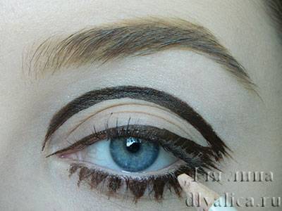 Так как это стилизация макияжа Твигги, то продолжать стрелку вы можете так, как нужно вам. Её можно слегка расширить от зрачка. Только не заводите хвостик слишком высоко, так как эти линии нам нужно будет уводить вниз.