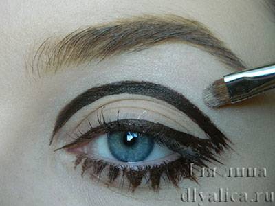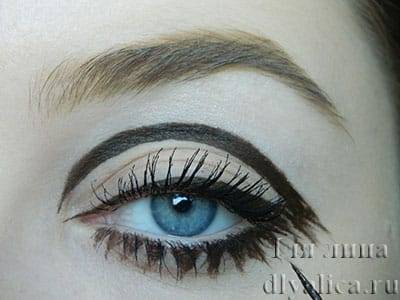 - Тени наносятся по следующей схеме: на верхнее веко в область под бровью кладется светлый оттенок, а складка затеняется темным. Границы перехода цвета тщательно растушевываются. Должен создаваться эффект единого цвета. Линию роста ресниц на верхнем веке обрамляют жирной стрелкой, не выходящей за внешний уголок глаза.