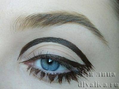 Первым элементом прокрасим стрелку по верхнему веку. Она должна быть очень тонкой и начинается чуть ближе к переносице.