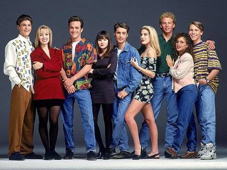 В 90-е особую популярность приобрела одежда из денима – в ней ходили абсолютно все. Это не только джинсы, но и юбки, шорты, сарафаны у девушек и комбинезоны у представителей обоих полов.