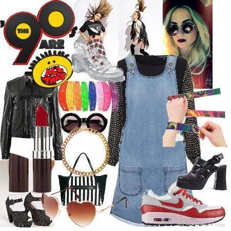 Модница 90-х — это девушка с разлетающимися локонами смелых оттенков, глянцевой помадой на губах, такими же блестящими тенями на веках и насыщенными румянами на скулах. Коротенькое платье непременно было украшено разнообразными блестками, если девушка надевала колготки, то обязательно ярких цветов, дополненные «потрепанным» сексуальным топом, надетым поверх шорт, а туфли на высоком каблуке обязательно были украшены стразами.