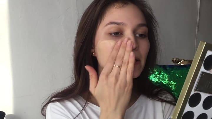 Кисточкой, спонжем или бьюти-блендером накладывают тонкий слой тональной основы в цвет. При необходимости используется корректор для маскировки покраснений или других пятен.