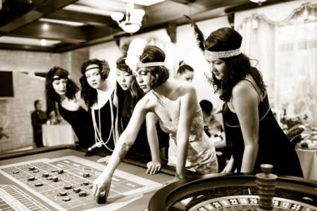 Банкетный зал как в Чикаго.Для поддержания атмосферы того времени нужно украсить соответствующе зал для банкета. Можно повесить на стены черно-белые фотографии с видами Нью-йорка, поставить один или несколько (зависит от числа приглашенных) столиков для игры в карты, украсить столы красными розами. В качестве музыкального сопровождения может звучать и современная музыка, но все-таки предпочтительнее остановить свой выбор на джазе, блюзе, танго. Хорошо, если есть возможность пригласить живых музыкантов.