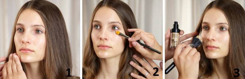 Подбирается тональное средство, которое максимально подходит данному типу кожи. Такая основа может быть в виде крема или эмульсии, она должна иметь легкую текстуру. Тональное средство лучше наносить с помощью кисти, и тщательно растушевать его от центра к краям, чтобы сделать его максимально незаметным.
