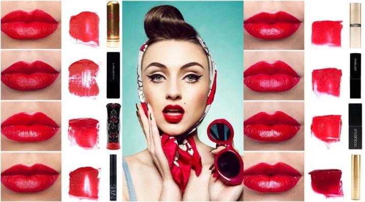 Брови и глаза стоит подвести карандашом или подводкой. Тени должны быть лиловыми, серыми, синими или болотными. Для такого макияжа важен не блеск, а именно помада. Потому что цвета ее призваны манить и заставлять прикоснуться к сладкому меду женских губ. Выбирать нужно алые, терракотовые, вишневые и оранжевые оттенки. Цвет «пыльной розы» или персика не теряет своей популярности и сегодня: стилисты активно используют его, создавая ретро-макияж, многочисленные фото это подтверждают.