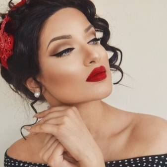Как правило, макияж “Pin Up” предпочитают уверенные и яркие девушки. Выбирая этот стиль, красотки становятся не только женственными кокетками, но и выглядят задорно, пленительно. Главным правилом в данном макияже является ровная текстура лица, оформленная в белом и персиковом цвете и полное отсутствие недостатков кожи. Брови должны иметь правильную форму, которая предусматривает умеренное выщипывание. Для выразительности глаз применяют четкие стрелки, а губы красятся яркой помадой.