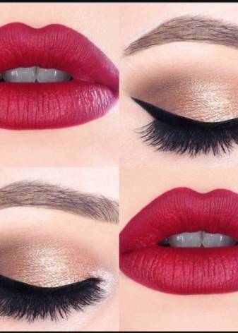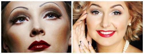 - Что же касается губ, то они красятся исключительно яркими помадами. Как правило, предпочтение отдается красным цветам, но допускаются эксперименты с другими оригинальными оттенками. Красиво смотрится цвет сливы или вина. Перед нанесением помады губам обязательно придается форма при помощи карандаша.