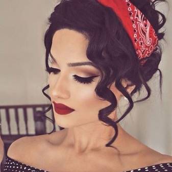 Но главное, что отличает причёски пин-ап, это яркие косыночки, шляпки, повязки и газовые шарфики, повязанные бантом или простым узлом. Для создания и закрепления причёски используются невидимки и шпильки, как обычно, но отделка причёски очень выразительна. При этом платки и шарфики обязательно вписываются в остальной наряд, в той же гамме цветов или, наоборот, создают броский контраст. Но уж с цветом губной помады они обязаны красиво сочетаться.