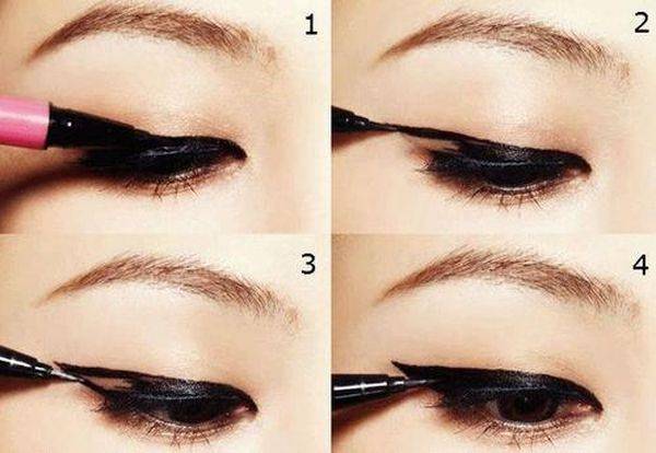 К внешнему уголку глаза линия должна немного расширяться, а, уходя в стрелку, вверх, снова сужаться, и на кончике должен остаться тонкий хвостик. Сделать стрелку под небольшим углом или сильно увести вверх – решать уже вам, ведь вам виднее, как вам больше к лицу.