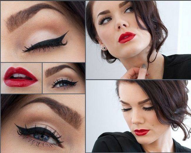 И самое главное – стрелки! Это главный элемент макияжа глаз в стиле ретро, в частности пин ап макияжа. Глаза по линии роста ресниц должны быть подведены весьма толстой линий, но тут все зависит от индивидуальных особенностей – кому-то это просто не идет.