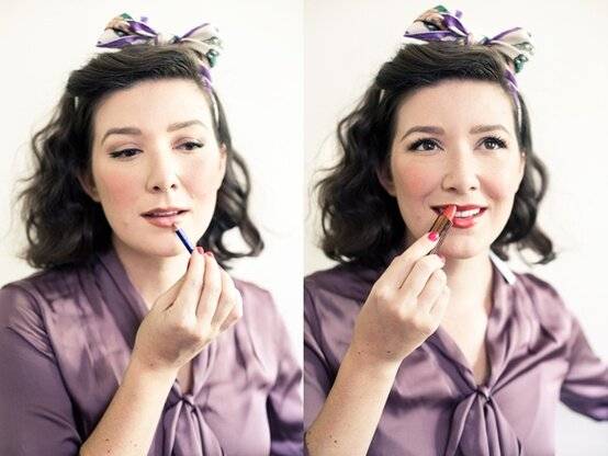 - После этого на губы нанесите помаду атласной плотной текстуры. Чтобы образ соответствовал романтике 50-х годов, можно использовать декоративную косметику для губ красных теплых тонов.