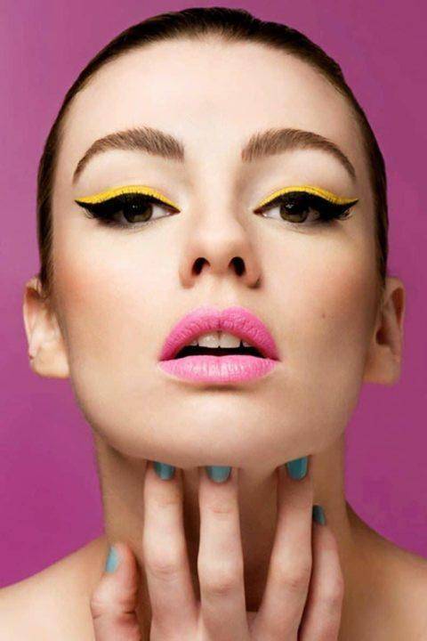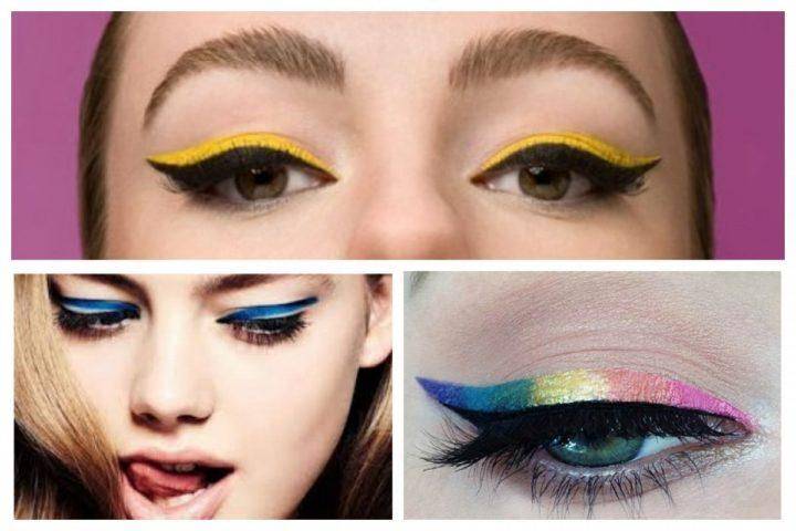 С такими стрелочками ваш макияж будет особенно оживленным и игривым. Вы даже можете рисовать стрелочки двумя разными цветами, делая стрелку омбре или просто создавая двойную линию. Интересным решением будет внутренний уголок глаза выделить в желтом карандаше, а все остальное верхнее веко подрисовать в голубом или синем тоне.