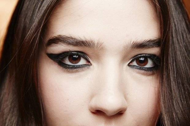 Взгляд кошки смотрит на нас с многочисленных фото последней недели и моды. В то время как большая часть лица была в минимальном цвете, глаза поражали своей яркостью. Глянцевая жидкая подводка с большими крыльями на внешнем углу — несомненный тренд нового сезона.