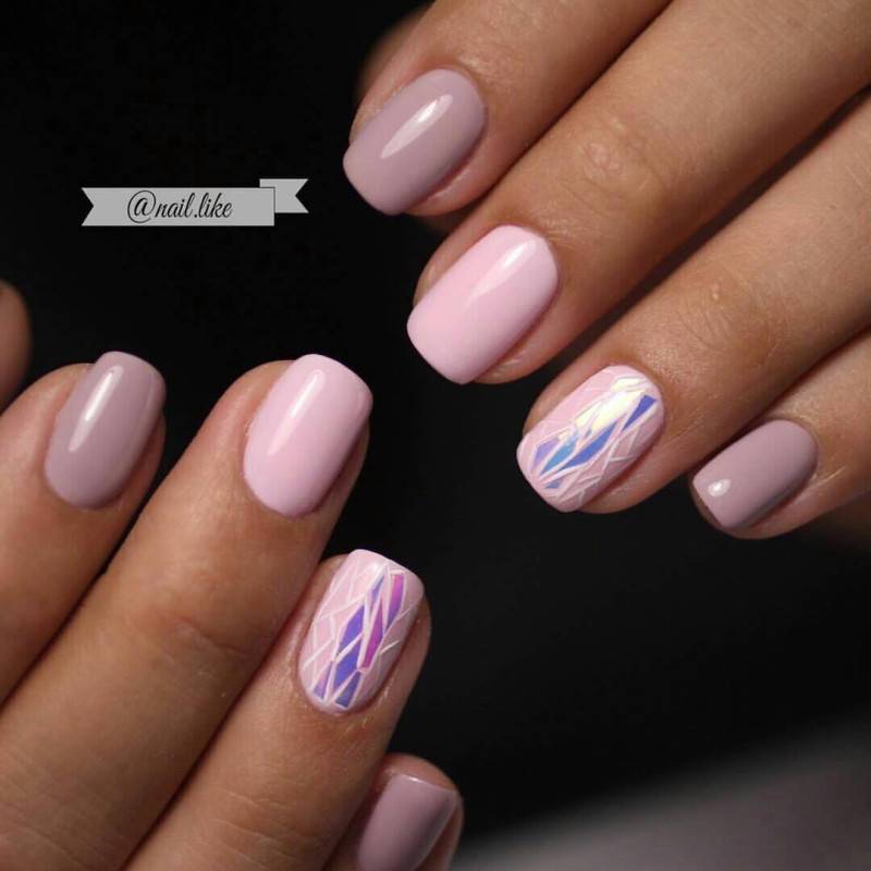 Для того чтобы маникюр выглядел лаконичным, но при этом имел свою неповторимую изюминку, можно оформить в стиле «битое стекло» только несколько ногтей, а остальные покрыть однотонным гель-лаком. Конечно же, сложно не упомянуть о романтичном и нежном варианте, в котором используются лаки пастельных тонов или вообще бесцветное покрытие, поверх которого в хаотичном порядке укладываются фольгированные кусочки.