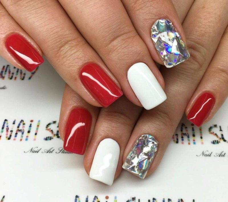 И цвет лака, и форма кусочков может отличаться. Материал можно нарезать в виде треугольников, ромбиков, квадратов. Их диаметр тоже может сильно отличаться друг от друга. Вы легко сможете сочетать стеклянный дизайн с прочими техниками маникюра.