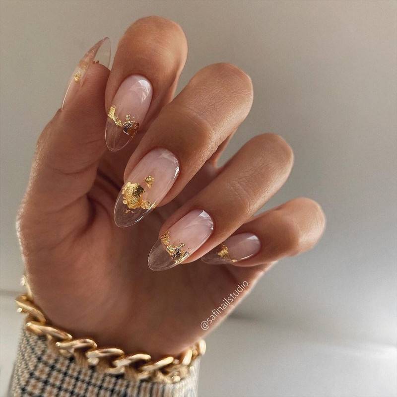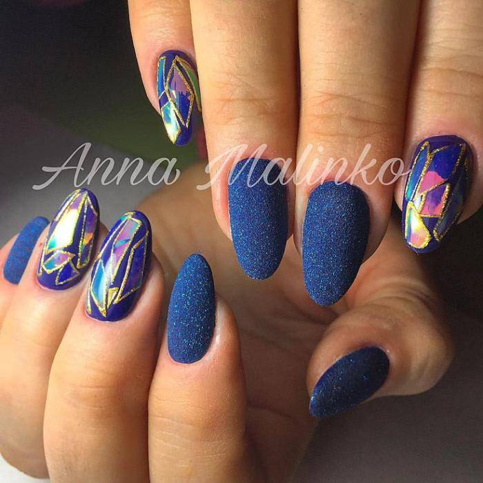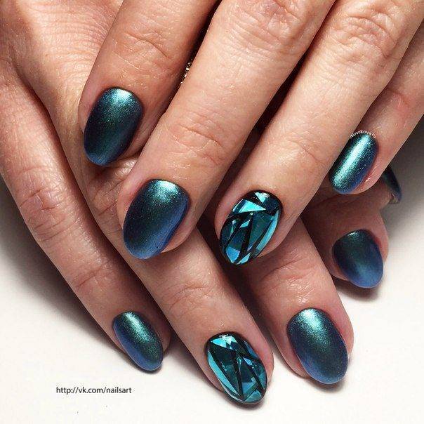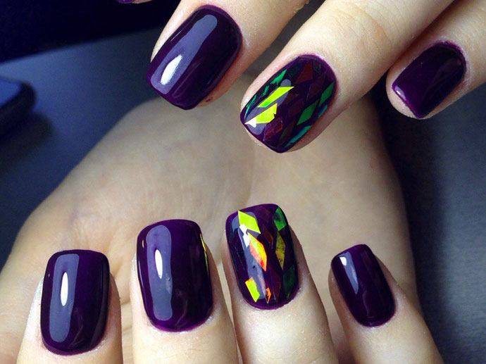 Блестящие кусочки всегда красиво дополняют основу глубокого оттенка. Сейчас в тренде лак тёмно-синего, фиолетового и вишневого цвета. Однотонным покрытием можно прокрасить большую часть ногтей, а осколками украсить один-два пальчика каждой руки. Бесцветное покрытие или фон пастельных тонов с кусочками фольги в хаотичном порядке — вариант более нежный.
