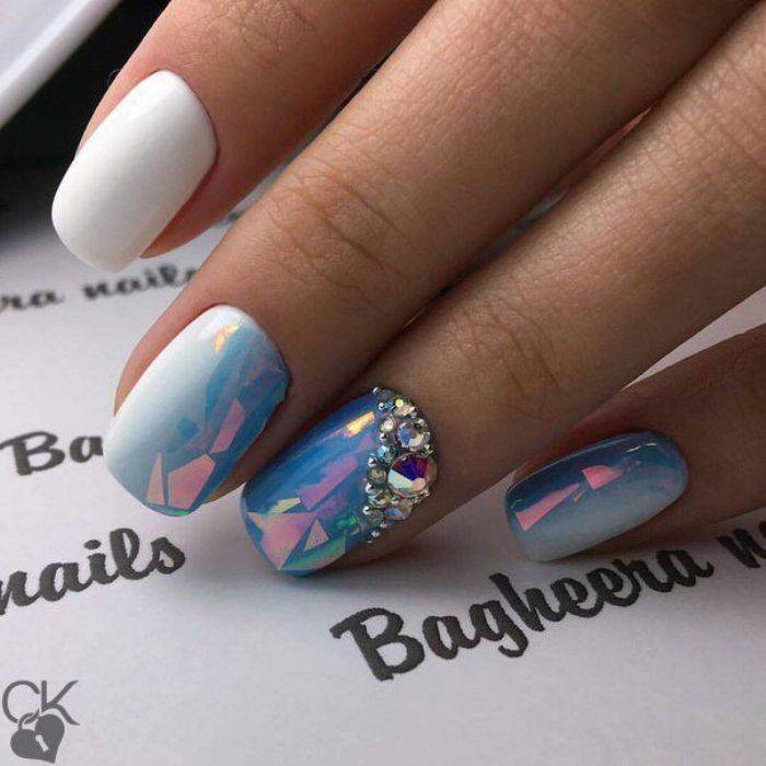 Как любой другой маникюр, «битое стекло» может иметь различные варианты дизайна. Для создания необычного эффекта доступна разноцветная фольга, зеркальный целлофан, голографические наклейки и т.д.