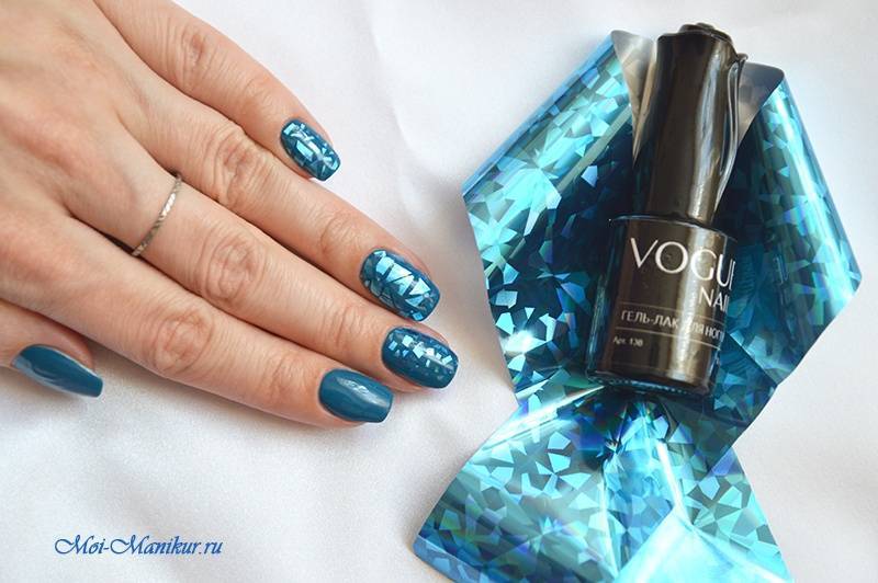 Как вариант, можно использовать блестящую фольгу и того же тона цветовую базу в виде гель-лака. Привлекательно выглядит маникюр, где кусочки фольги располагаются хаотично и представлены «осколками» разных размеров.
