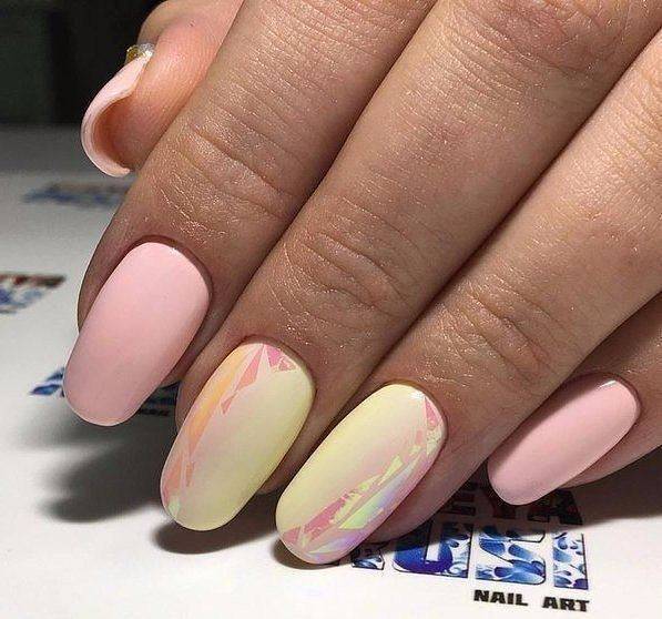 Для того чтобы маникюр выглядел лаконичным, но при этом имел свою неповторимую изюминку, можно оформить в стиле «битое стекло» только несколько ногтей, а остальные покрыть однотонным гель-лаком. Конечно же, сложно не упомянуть о романтичном и нежном варианте, в котором используются лаки пастельных тонов или вообще бесцветное покрытие, поверх которого в хаотичном порядке укладываются фольгированные кусочки.