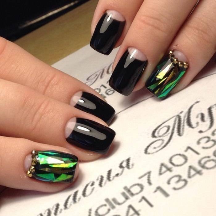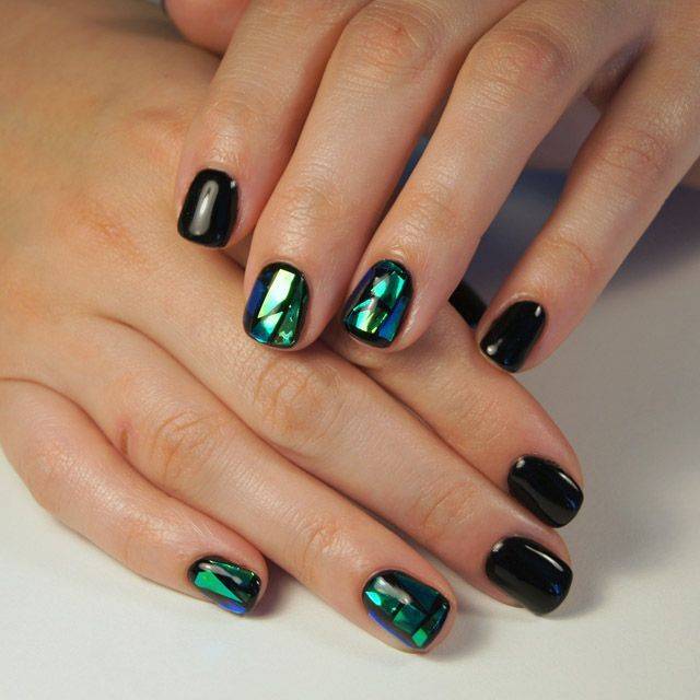 Если вы решили фольгу заменить сухой слюдой, то гель-лак подбирайте подходящей тональности. Например, к слюде изумрудного цвета подойдет зеленый шеллак. «Битое стекло» на светлом фоне выглядит нежно, но не выразительно. Более интересные вариации получаются при сочетании голографии с темными цветами вплоть до темно-синего и черного.