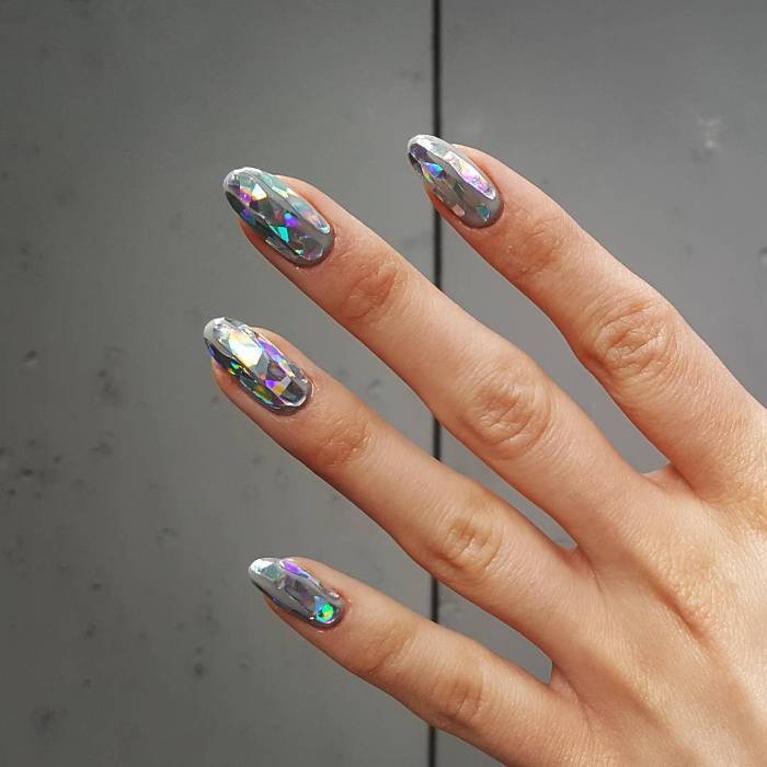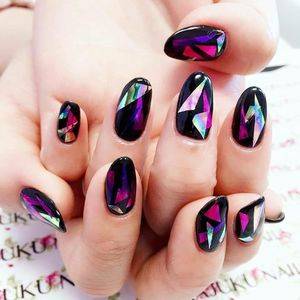 Эффект битого стекла на ногтях достигается за счет отражения света и лучей на материале. Такой нейл-арт напоминает узоры калейдоскопа и мозаику — он придется по вкусу любителям фантастического стиля.