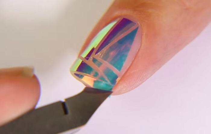 Преимущество специализированного материала в том, что его продают чаще всего уже нарезанным и остается лишь распределить обрезки по поверхности обработанного заранее ногтя. Альтернативой стали ненарезанные полоски, которые можно накрошить по собственному усмотрению на кусочки более подходящего размера и формы. Такие радужные «осколки» одинаково привлекательно выглядят на темной и на светлой подложке.