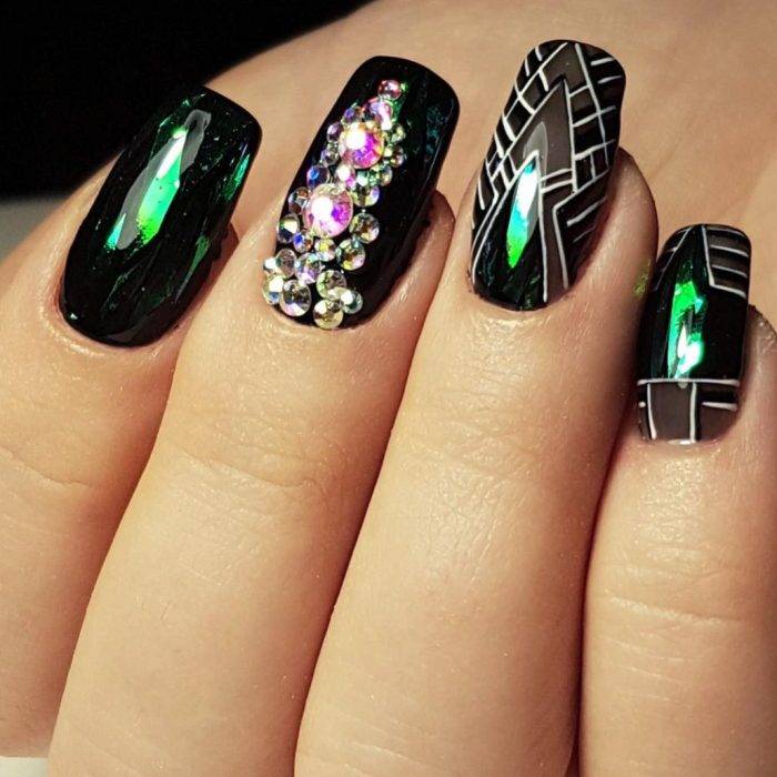 Эффектно выглядит модный маникюр при использовании черного фона с серебристыми или золотистыми осколками. Такой дизайн ногтей создает трехмерный узор, который завораживает и притягивает взгляды. Им можно любоваться целую вечность. Сейчас также востребован геометрический маникюр с битым стеклом.