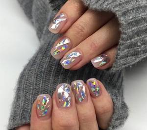 Если решено использовать фольгу, то следует выбирать непереводную. Нужно учитывать, что любая фольга толще специальной пленки и ее распределение по липкой поверхности гель-лака может вызвать некоторые затруднения. Самый естественный вариант – это «битое стекло» на прозрачном лаке.