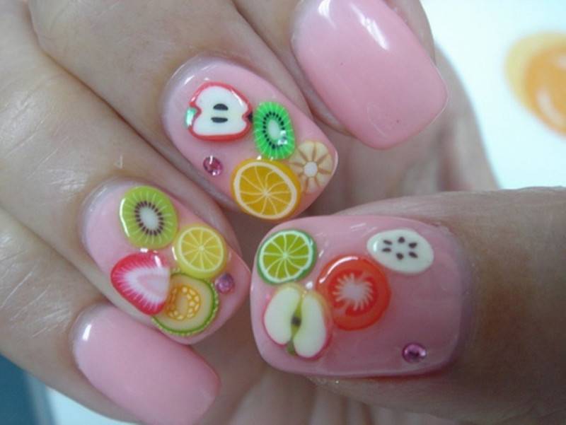 Однако довольно забавно смотрятся ноготки в виде клубничек или божьих коровок. Часто для детского маникюра используют всевозможные наклейки, с помощью которых можно быстро разукрасить каждый ноготь, например, изображением любимого героя мультфильма.