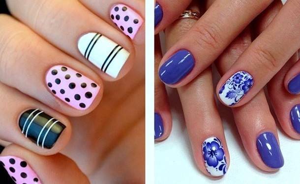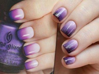Второй вариант предлагает сделать переход от одного цвета к другому, постепенно меняя тон на пальцах. Например, ноготь большого пальца можно окрасить в фиолетовый, указательный – в лиловый, средний – в сиреневый, безымянный – в пастельно-розовый, а мизинец – в более насыщенный цвет. Ещё один вариант предполагает постепенное осветление тона. То есть на большой палец наносят наиболее темный оттенок цвета, а на каждый последующий – оттенок, который чуть светлее предыдущего. Получается очень оригинально.