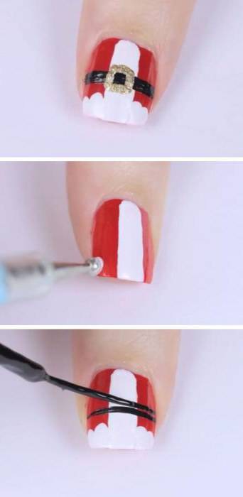 Маникюр на какое-либо событие всегда высоко ценится, ведь он еще больше создает праздничную атмосферу. Новогодних вариантов украшения ногтей существует множество, но одним из наиболее распространенных является не что иное, как одежда Санта Клауса. Для создания нужно будет взять лаки таких цветов: красный, белый, черный, золотой.