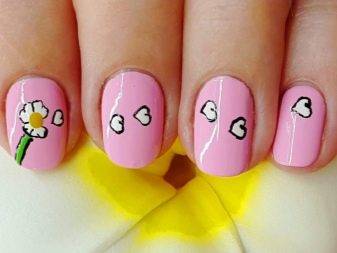 В данном случае можно дать простор фантазии. Маникюр делается с разнообразными рисунками в зависимости от пожеланий дочки. Картинка наносится либо иголкой, либо тонкой кистью. На ногтях можно изобразить сердечки, цветы, ягоды и даже героев мультфильмов.