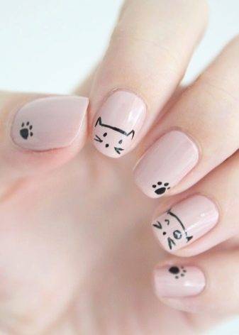- Изображения животных. Красиво смотрится на детских ноготках зайчик. Сделать маникюр в домашних условиях очень просто. Для работы потребуется белый, черный и бесцветный лак. В первую очередь ногтевую пластину покрывают бесцветным лаком, на край наносится белый лак, прорисовываются уши. Используя черный оттенок вырисовываются глаза, рот.