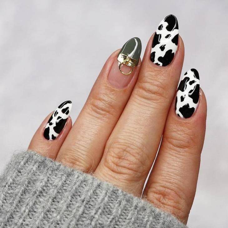 Финишное топовое покрытие для дизайна ногтей коровий принт может быть как глянцевым, так и матовым. Все дело в личных предпочтениях женщины.