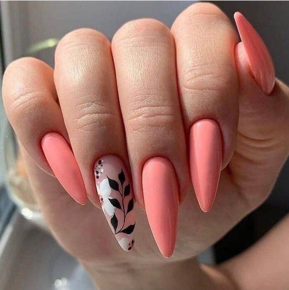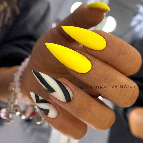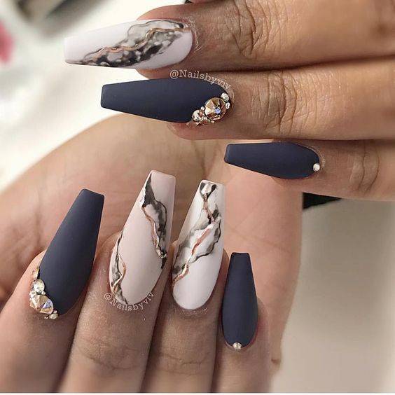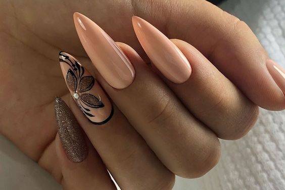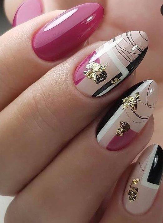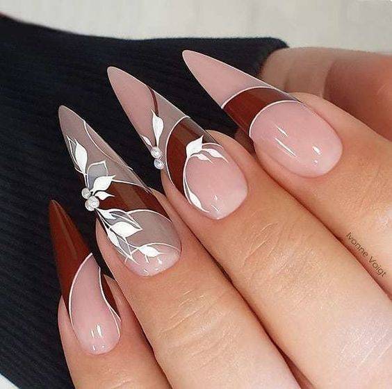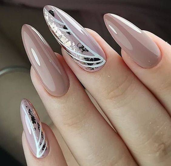 Для работы с ними подойдут те же дизайны, что и для коротких ногтей, но площадь ногтевой пластины позволит добавить узоров и комбинаций. На нюдовых базах отлично смотрятся белые и черные кружева, интересен витражный дизайн.