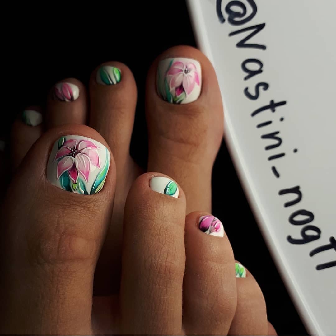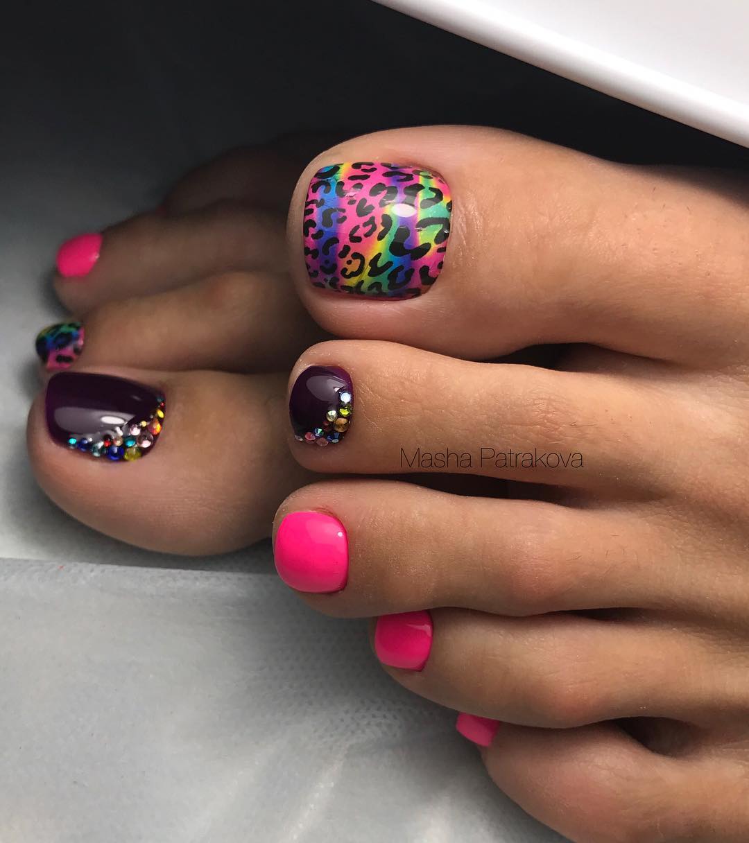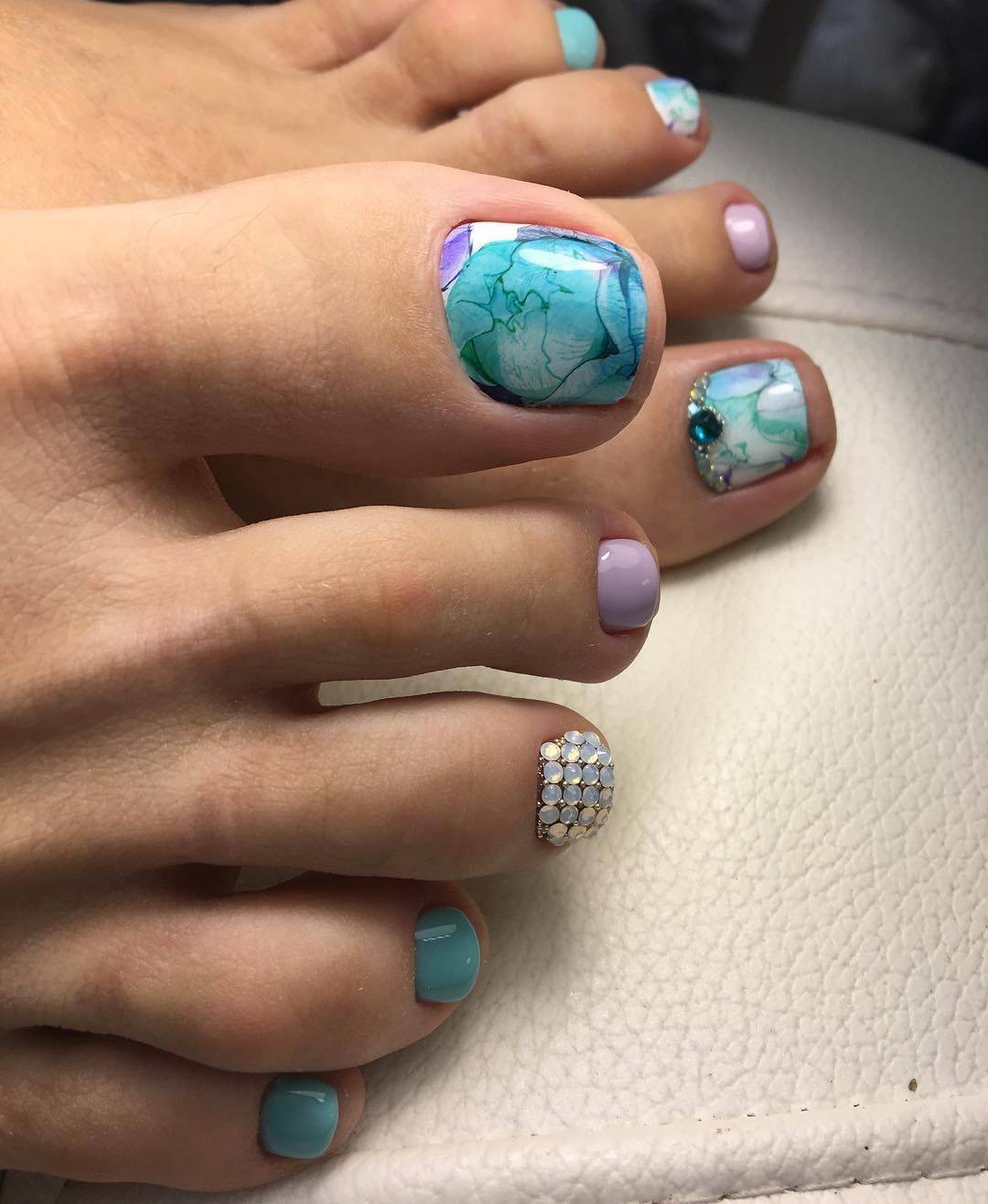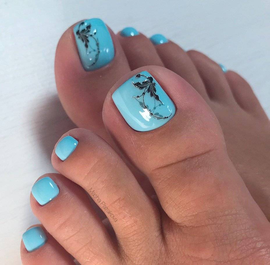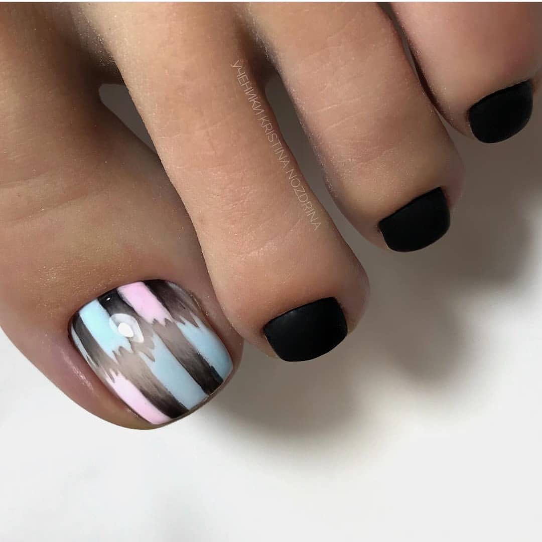 В одном педикюре, несомненно, можно сочетать сразу несколько интересных вариантов. Например, один палец можно украсить контрастным изображением, а другие пальцы — однотонным покрытием в пастельных тонах.
