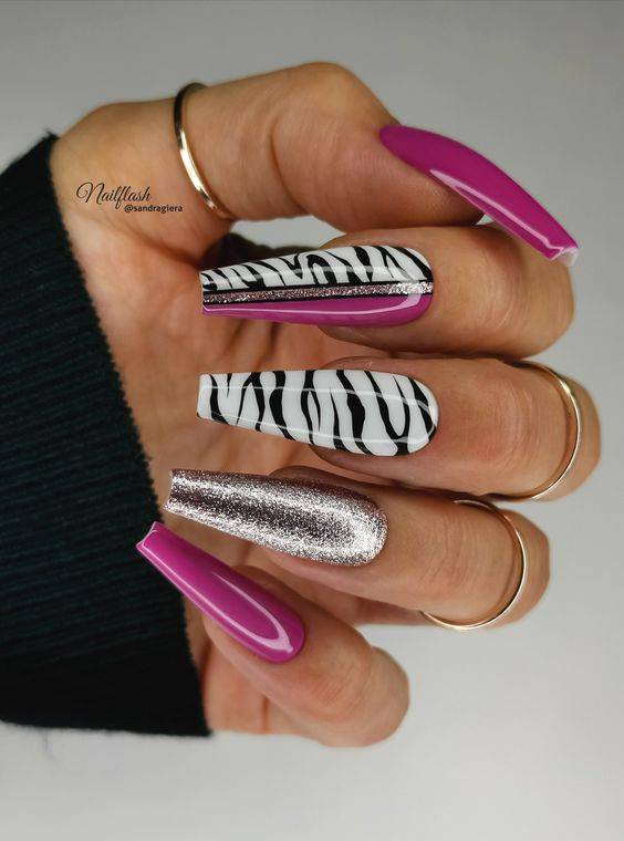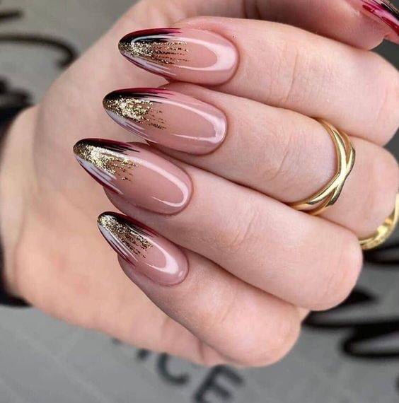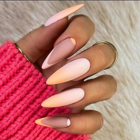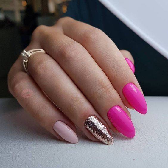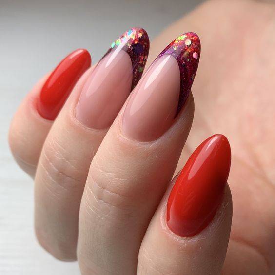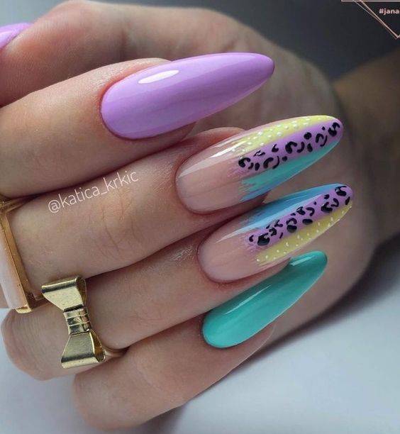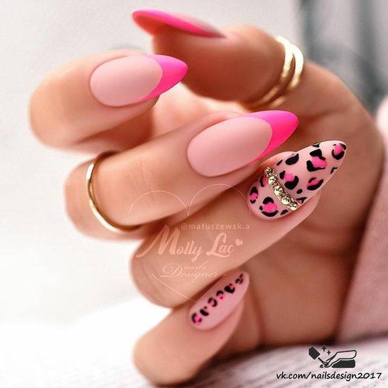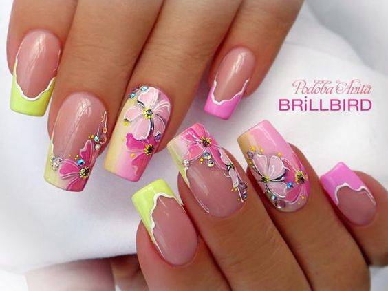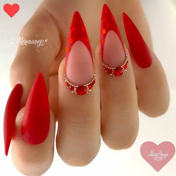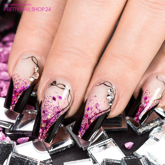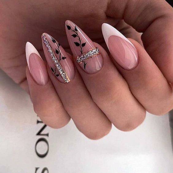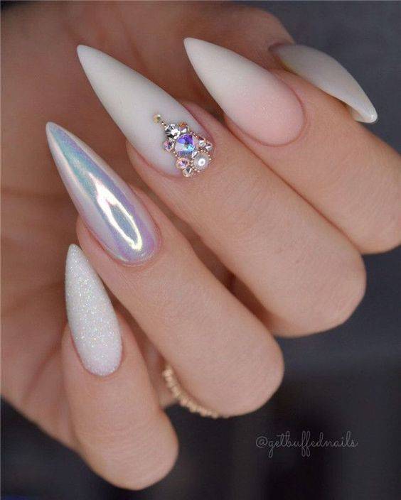 Нередко нейл-специалисты украшают пальчики разными оттенками, стразами, которые выкладывают в хаотичном порядке или придерживаясь определенного направления.