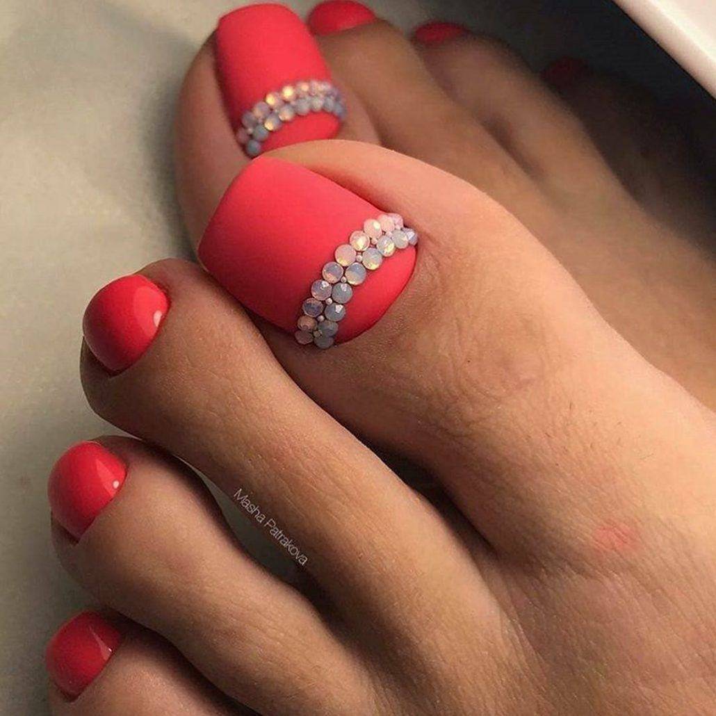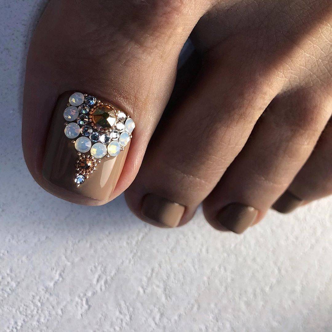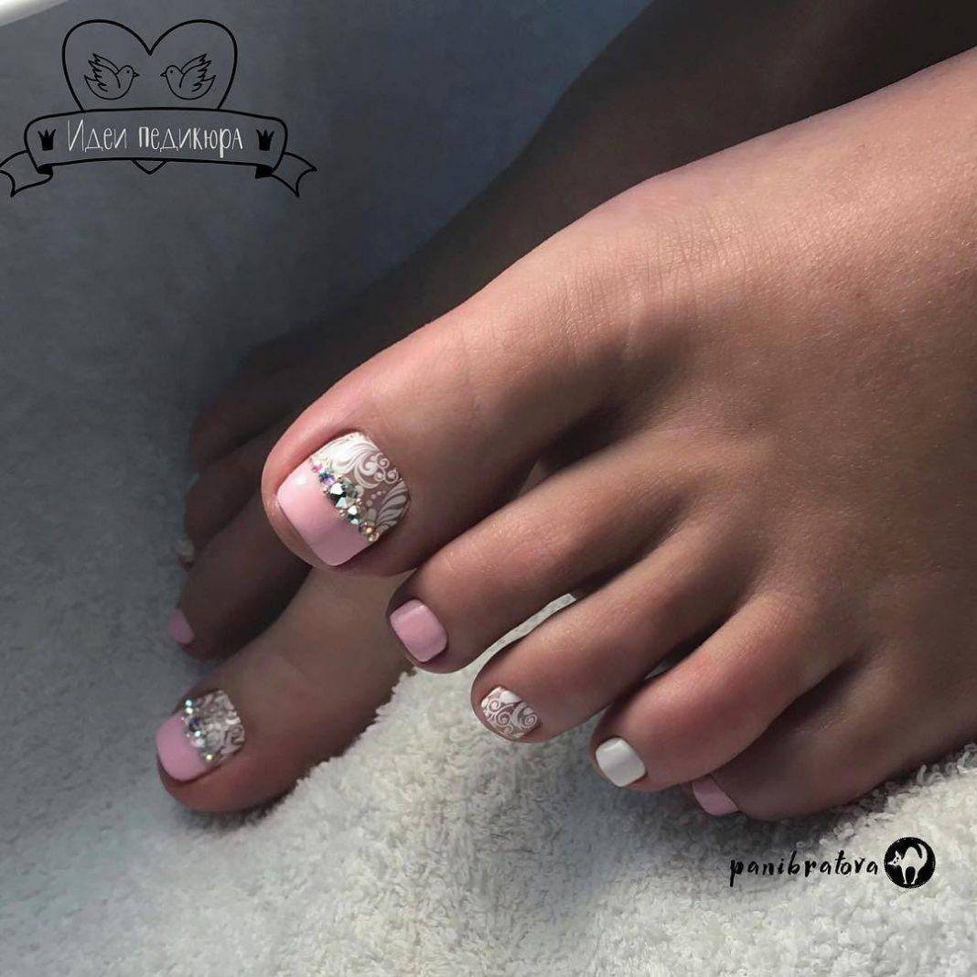 К стразам в нежной цветовой гамме подойдет бежевая палитра или светло-розовые оттенки шеллака. Педикюр выглядит очень утонченно, если задействовать нежные бусины с жемчужным переливом для украшения.