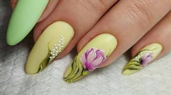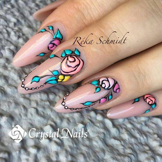 Наносить рисунки нужно на базовый цветной или прозрачный слой в зависимости от задумки. Кроме акриловых рисунков можно сделать темпинг дизайн или использовать готовые наклейки. Дизайн покрывается топовым покрытием и высушивается в лампе. Камушки и стразы лучше сажать на топовый слой до сушки. Когда слой застынет, камушки «намертво» прикрепятся к ногтю.