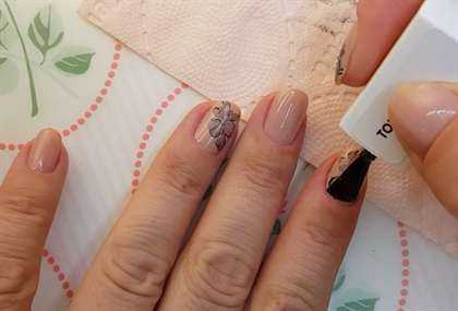 Для создания кружевных узоров подойдёт и переводная фольга. На обработанные и подготовленные ногти наносится клей и накладывается фольга с выбранным узором. Деревянной палочкой как шпателем, разравнивается и быстрым движением, как фокусник покрывало, снимается с ногтя. Для закрепления наносится финиш.
