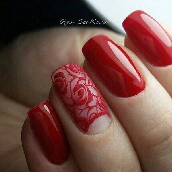 Способ создания красного маникюра вуаль практически не отличается от предыдущих нейл-артов. Кружево, точки, цветы, геометрия – все это великолепно выглядит в красном насыщенном цвете. Что касается контрастов, то лучшим дополнением красной вуали будет черные элементы. Черно-красный маникюр выглядит по-настоящему шикарно и обворожительно.