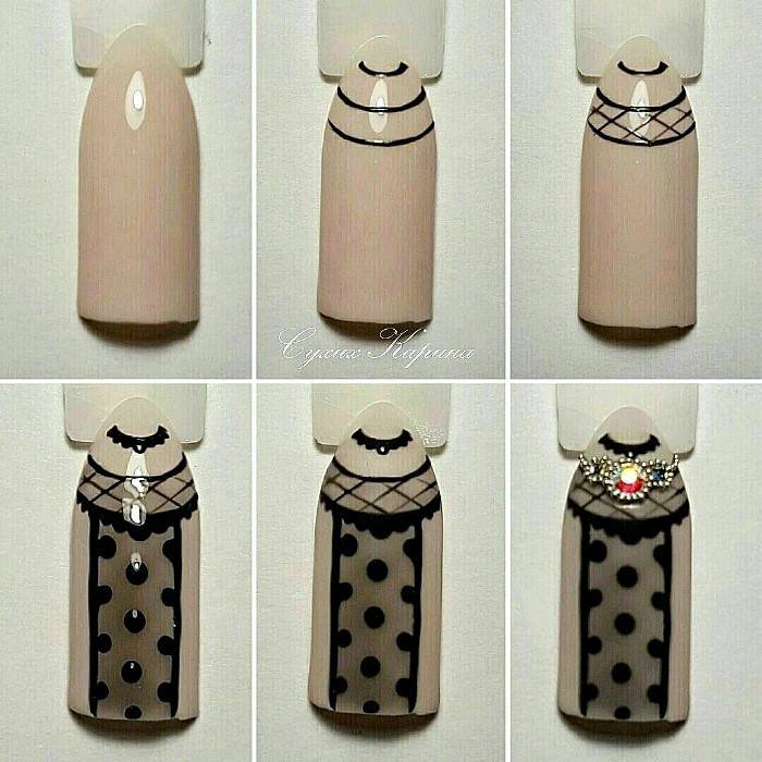 Чтобы сделать маникюр-колготки черного цвета, понадобится темный лак. Для того чтобы создать черную вуаль, делают прозрачный или полупрозрачный темный фон. Последний получают путем смешивания черного гель-лака с базой. Специалисты советуют производить такие манипуляции в отдельной емкости и смешивать жидкости апельсиновой палочкой или дотсом.