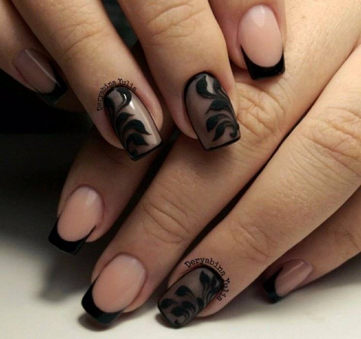Маникюр чёрная вуаль встречается в этом сезоне довольно часто. Женщины носят его не только на какие-то праздничные мероприятия, но и в повседневной жизни. И это не удивительно. Это раньше вуаль требовала определённого наряда. Сейчас же она распространена повсеместно. На известнейших китайских сайтах продают даже спортивные шапки с вуалью. Но дизайнов этого вида маникюра огромное множество.